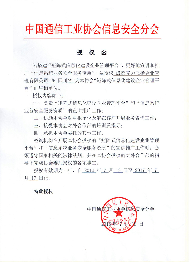 中国通信工业协会根据《关于制定"信息系统业务安全服务资质管理办法》的批复(【2014】通协字第35号)要求,制定并通过了服务的评定条款,用以适应我国信息系统建设安全保障的需求,提高信息系统业务安全服务能力。